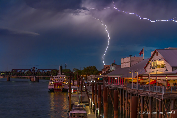 I met with a group of local photographers in downtown Sacramento. At first, a scavenger hunt was the goal, but after looking around Old Sac, I went to the Tower Bridge. After watching the dry lightning strikes I listened and began to anticipate the next bolt of lightning. Got it!