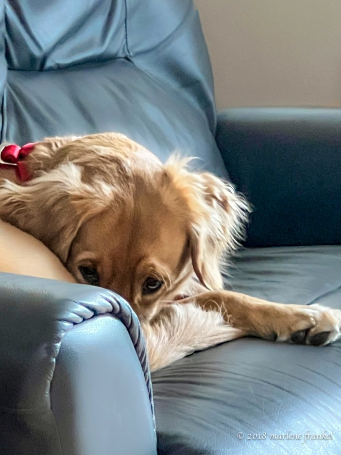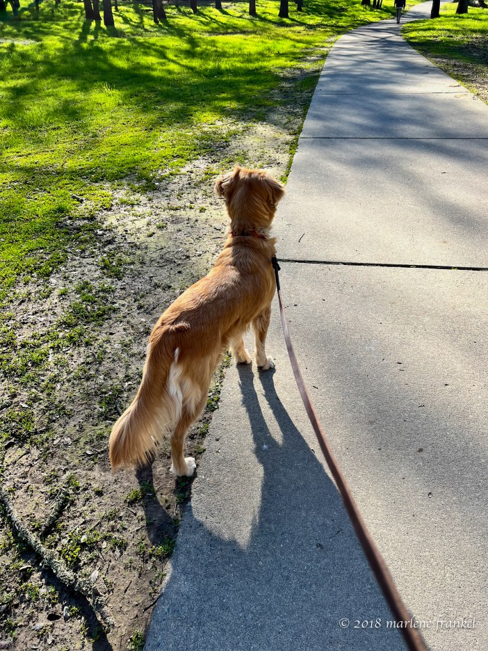 I like to take walks. My neighborhood has 4 courts, and a private road so there is little traffic and some up-and-down elevations. At first, Moxie, my Golden Retriever, had no trouble being my companion. Once a noisy garbage truck stopped next to us and wanted to meet her. This frightened her, and it has been a bit of a struggle to walk past our court ever since. I have tried to get her used to truck sounds. So, like my last dog, if I want to walk I need to first drive to a park trail. Not as spontaneous. Maybe as Moxie turns 2 she will grow out of these fears. She is also trying to contain her excitement when we walk. She pulls ahead then realizes that I have stopped and comes to a heal position. So our walks are more training than solitude until we take our nap together.