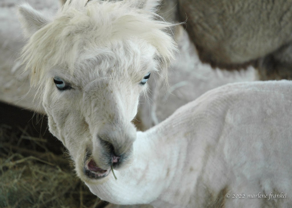 Alpaca after shearing. What is she trying to tell me?