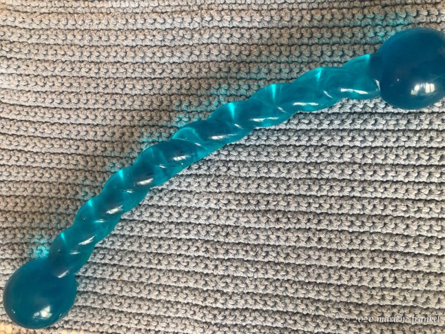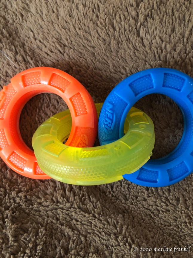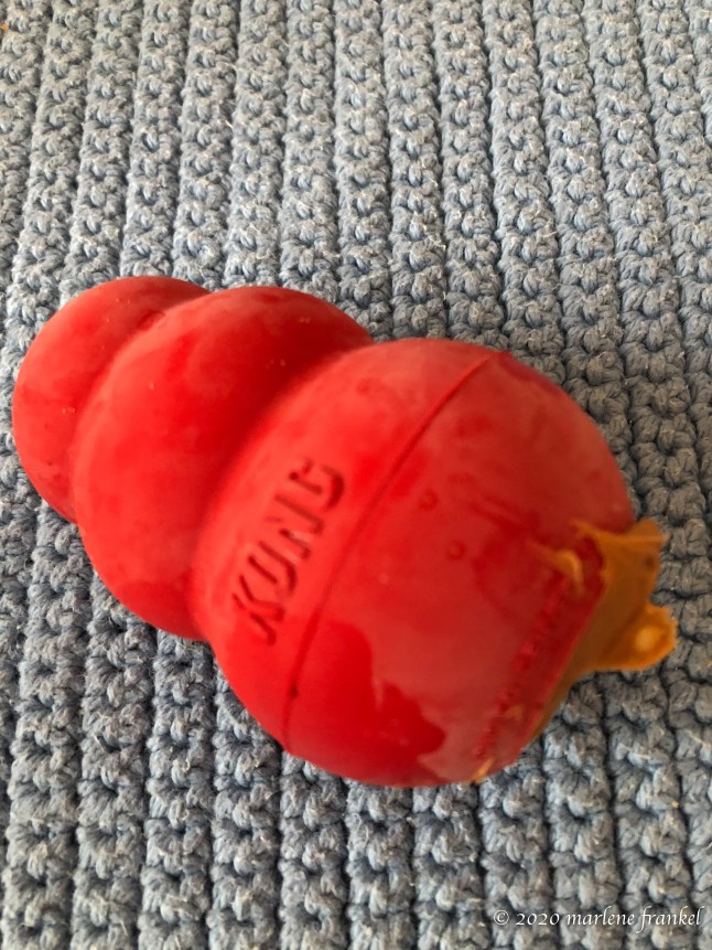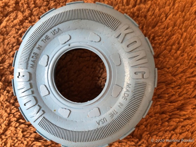 I skip past all the cute stuffed chew toys. Even the ones that say “Tuff”. I brought home a toy made from the same material as a fire hose. No problem for Charlie. Then I enter the aisle with hard stuff for chewing. I have one blue dog bone that I had for Libby. She never cared for it. I liked the fact that it was actually made here in the USA. Well, Charlie is not a fan either. I guess that is why it looks perfectly new. No teeth marks. I look at some softer rubber toys in a variety of shapes.