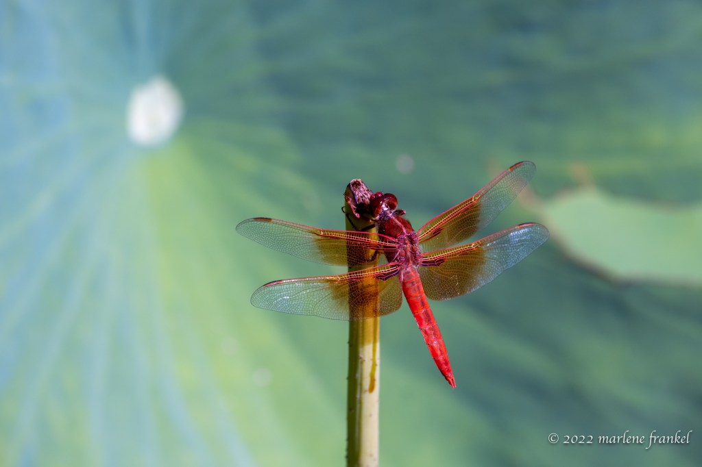 Dragonfly landing on a lotus