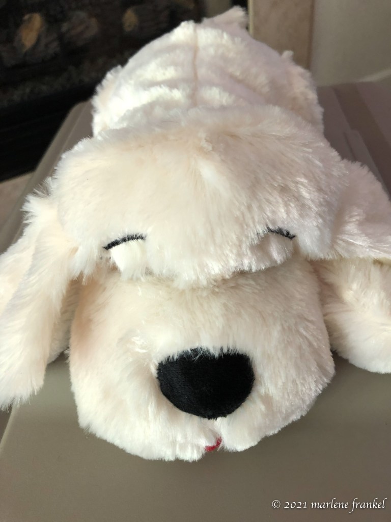 Puppyhood training is fresh in my mind, but Moxie is so very different a personality. She has taken to the crate, and goes in without a fuss. If she whines she settles down after a couple of minutes. When she falls asleep, she is so settled that I can pick her up and transfer her to her crate. I found her placing herself in her crate a couple of times. The only thing in her crate is her Snuggle Puppy. At night I turn on the heartbeat, and she uses the puppy as a pillow. I still have the one that Charlie used, and it is used in Moxie’s daytime crate. I was amazed that after the initial obligatory ear and tail amputation Charlie left the puppy alone. Moxie’s puppy has just had some ear licks applied.