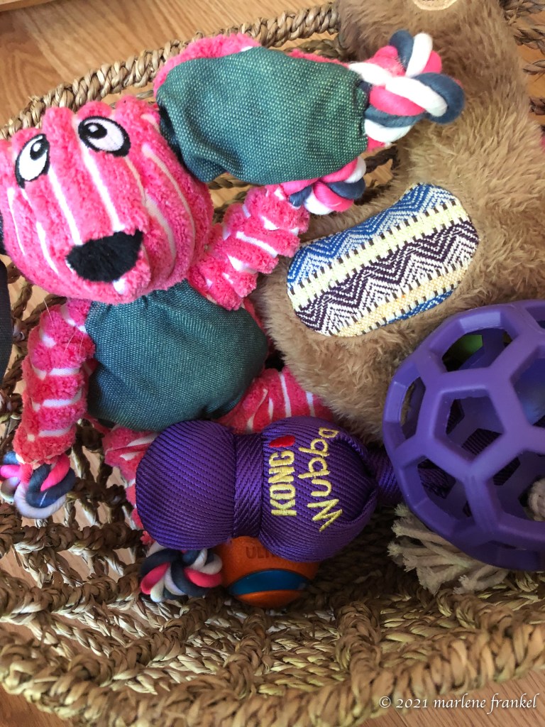 A basket of toys. Unfortunately, Moxie thinks the basket is also there to chew on. Looking for something to hold her growing group of toys. Maybe I will get her to pick up her toys when she is done. One can always hope!